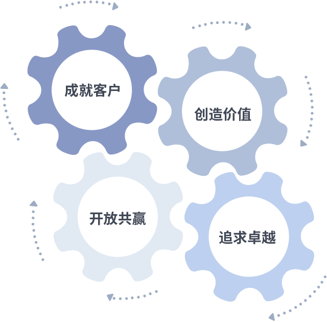 成就客户是一切决策的出发点,,创造价值是衡量所有工作的标准,,追求卓越是我们做事做人的态度,,开放共赢是我们的格局也是最终的结果。。。。价值观的齿轮环环相扣,,,推动着组织里的每个人不断向前。。。。